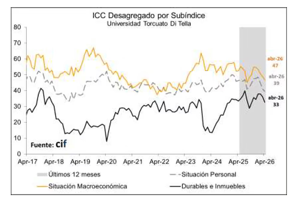 El Índice de Confianza del Consumidor cayó por tercer mes consecutivo en abril: 5,7% respecto del mes anterior, tras una baja de 5,3% en marzo y 4,7% en febrero, y acumuló cinco disminuciones seguidas en el cotejo con el año previo, según el informe que difundió el Centro de Investigación en Finanzas (CIF) de la Universidad Torcuato Di Tella.