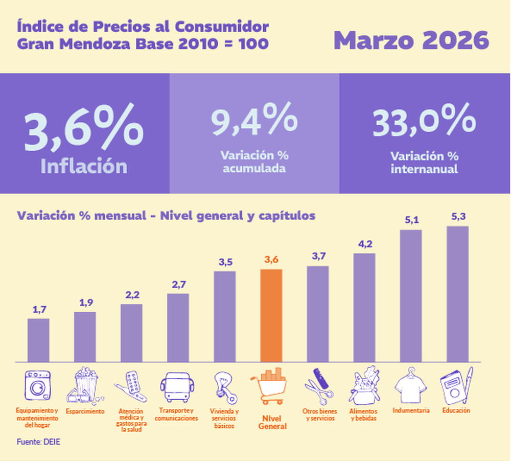La inflación de marzo en Mendoza trepó al 3,6%